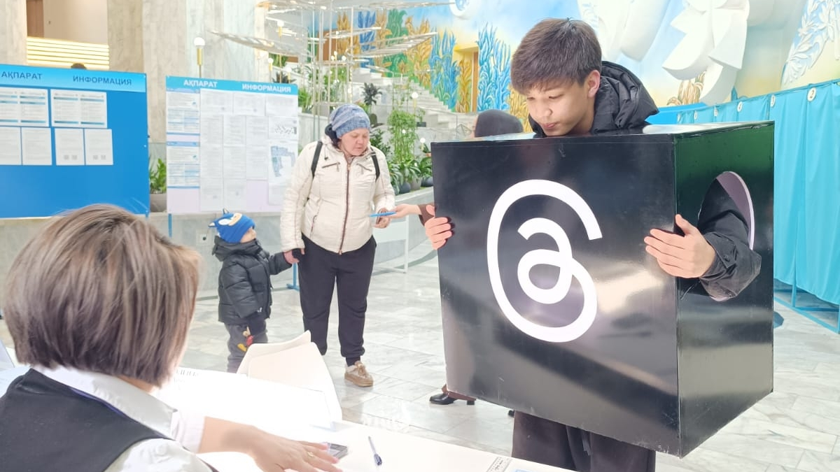На одном из избирательных участков Алматы жители стали свидетелями необычного события. 18-летний студент Нурсултан Дадыл пришёл проголосовать в костюме, стилизованном под социальную сеть Threads.